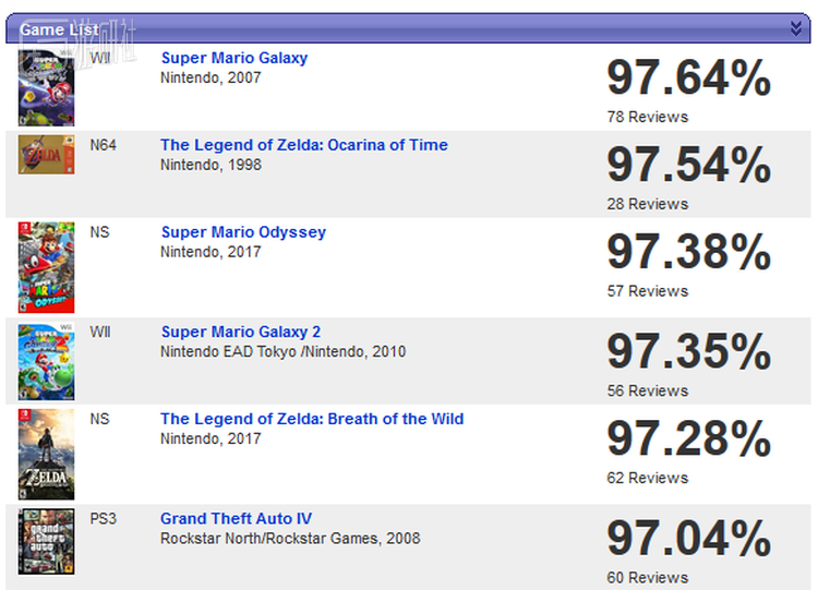 在游戏综合评分网站Gamerankings上,奥德赛的评分目前位列“史上评价最高的游戏”第三位,而今年的《荒野之息》位列第五,这是一项全平台的排名