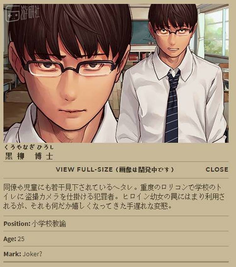 从某个第三方网站放出的人物介绍资料中可以看出,本作的男性角色之一,小学教师黑柳博士的确有恋童癖好,甚至他还往学校的厕所中安装了秘密摄像头。上面的两张照片,应该就是他所安放的摄像头中拍摄到的场景。