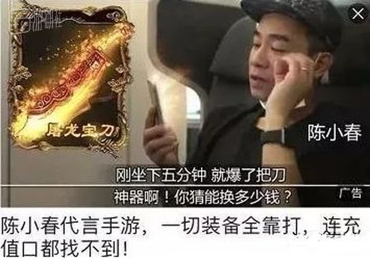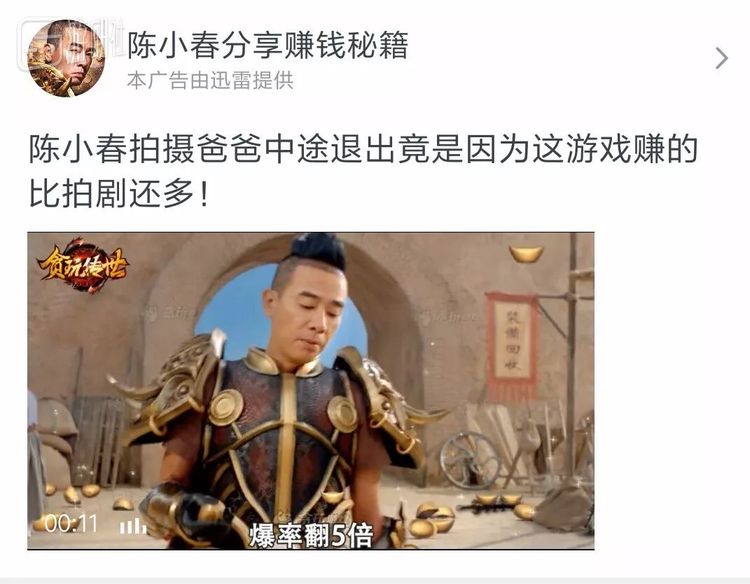 当然,涉及陈小春的广告也并非都是这么高端,在另一些广告渠道上,他就成了念打油诗的打金玩家和30多岁的孩子: