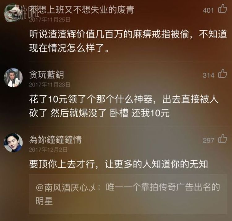 到这里,我短暂的贪玩蓝月之行就结束了,但互联网上与贪玩蓝月有关的“段子”并没有停止流行,并且以一种“喜闻乐见”的方式,逐渐成为了一类网络亚文化,这是此前的“油腻的师姐”们完全不能比拟的。就连游研社的官博下面,在以主要用户为单机游戏玩家的群体中,依然会时不时见到“大嘎好,吾系扎扎辉……”之类的调侃,并往往被点赞很多。