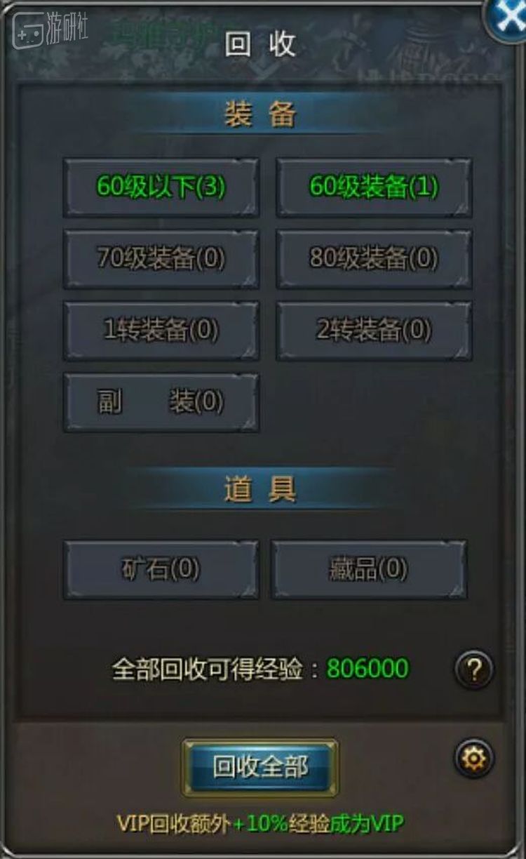 踌躇再三,始终没能刷出第二个史诗装备的我还是没能抵御住诱惑往游戏里充了10块钱兑换成元宝,当上VIP,穿上了一身史诗装备。我的角色立马又飞速升级,很快升到了可以进行装备回收的等级。于是我迫不及待地找到了NPC张家辉,打开了装备回收界面——