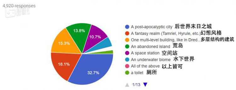 32.7%的人认为地图应该是一座后世界末日风格的城市,13.8%的人认为目前的荒岛地图就是最好的选择,这两种观点基本吻合现在市面上大部分的同类型游戏。