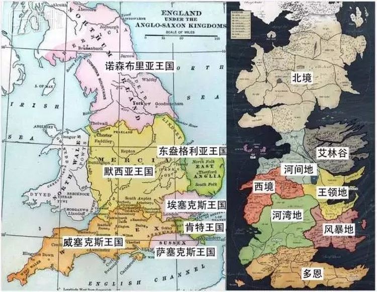 公元五世纪,罗马帝国在英格兰的统治开始崩溃,不列颠列岛迎来了盎格鲁-撒克逊人的时代:当时在列岛上一共有大小七个盎格鲁-撒克逊王国并存,这也是《权力的游戏》中维斯特洛大陆七国的原型。