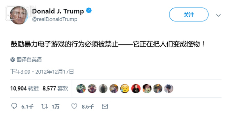 而如果有人愿意翻翻特朗普的大嘴巴语录的话,这已经不是他第一次表达过自己对电子游戏的偏见了:早在2012年桑迪胡克小学枪击案发生之后,他就在推特上写过:“鼓励暴力电子游戏的行为必须被制止,它正在创造怪物。”