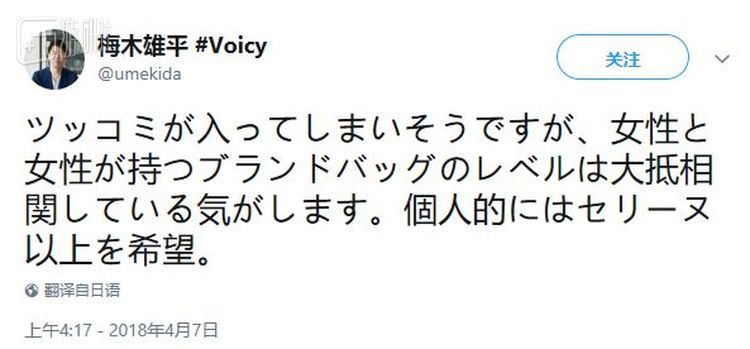 “话说,我在休息室的时候,对某些女性都不叫她的名,而是直接叫她的包的牌子,比如缪缪酱之类的(奢侈品牌-miumiu)。”