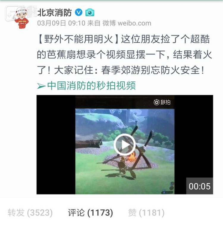 今年3月,北京消防的官方微博就在春季郊游频繁之际,恰到好处地发了“野外不能用明火”的警示,也用了林克玩火的短视频,效果拔群。
