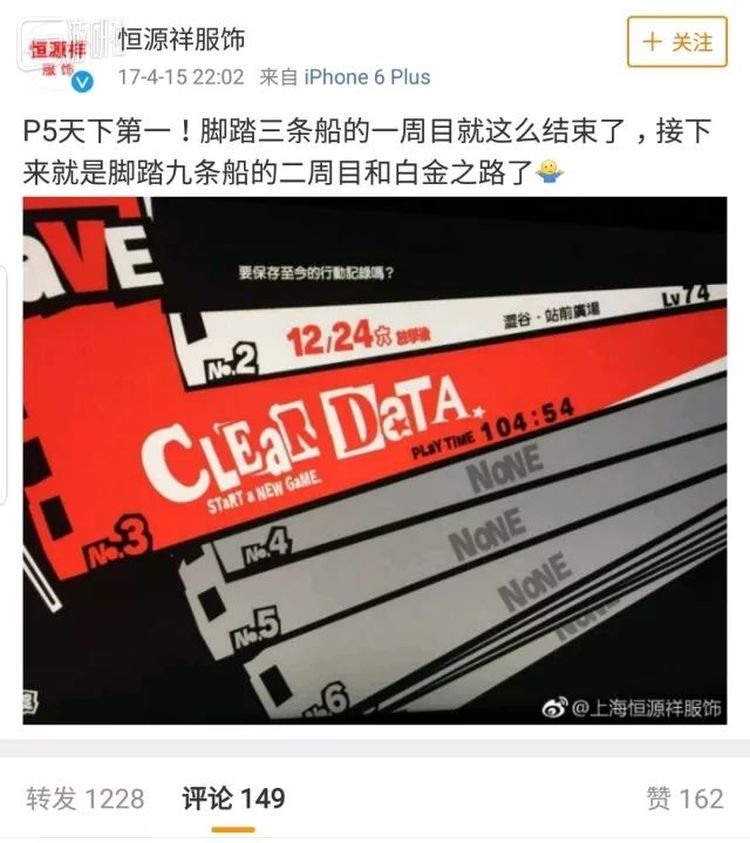 当时微博上的“恒源祥服饰”连发了一堆《女神异闻录5》相关的游戏体验,和玩家一道夸着“P5天下第一”。这条微博很快千转,传播效果远超恒源祥服饰平时的品牌运营内容。