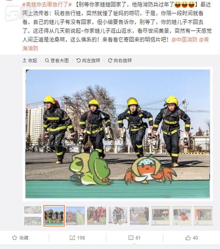 所以在接下来一两个月里,这批消防类的“国家大号”继续用《旅行青蛙》搞事情。