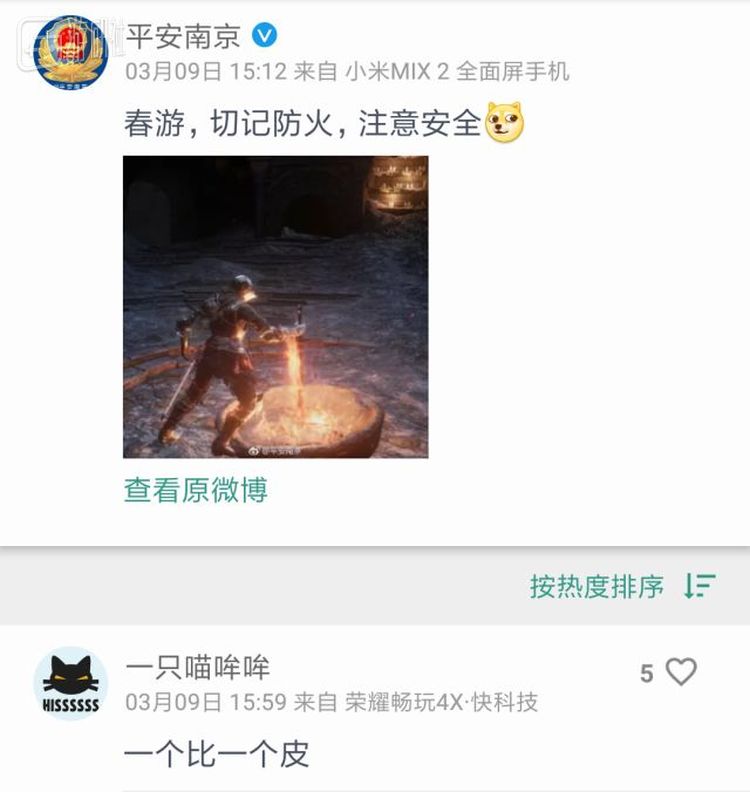 底下有南京平安等官博也来互动,贴了张《黑暗之魂》的传火场景,还很细心地加了狗头。