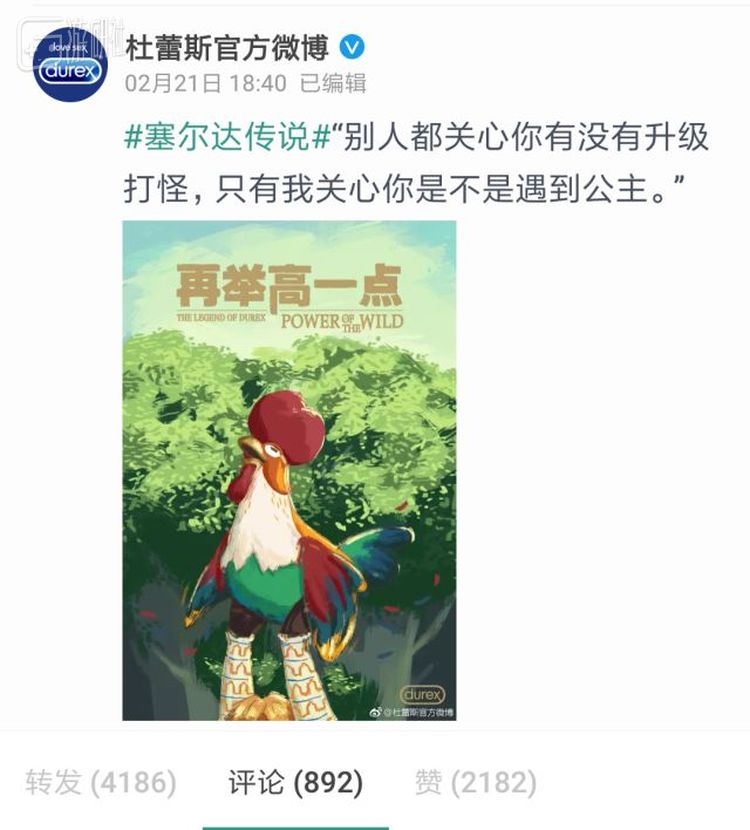 一年多过去了,我们也看到了更多调皮的官博君。就在前两天,另一个大品牌,杜蕾斯的官方微博也借游戏,为所欲为了一番。
