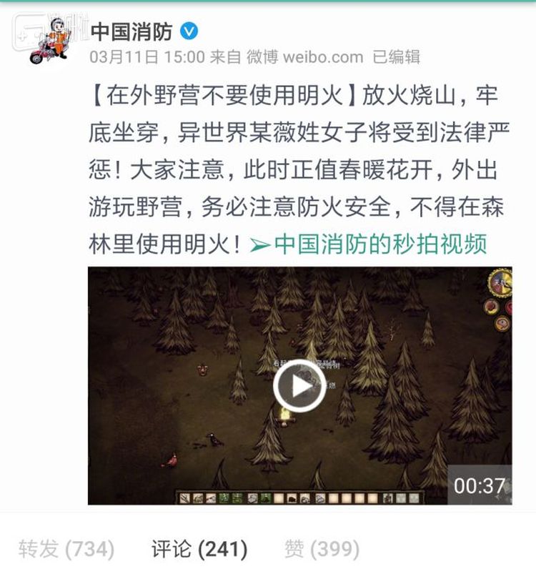 “放火烧山,牢底坐穿”,这位官博君总能在这样脍炙人口的消防警示语后面,跟上“异世界某薇姓女子”(《饥荒》中的薇洛,职业正是纵火者)等消防公告的常用表达,产生极大的反差感。
