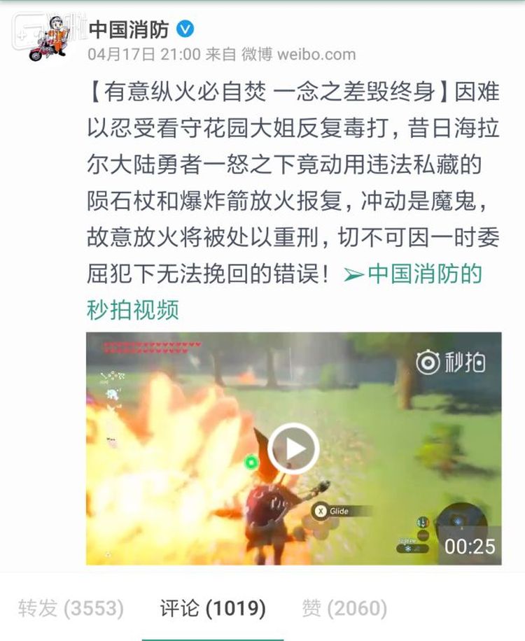 而这回“痛斥”昔日海拉鲁大陆勇者的中国消防,也正在以每月一、两条游戏消防的速度持续更新着,它的一些兄弟微博,更是在学习着它的创意。