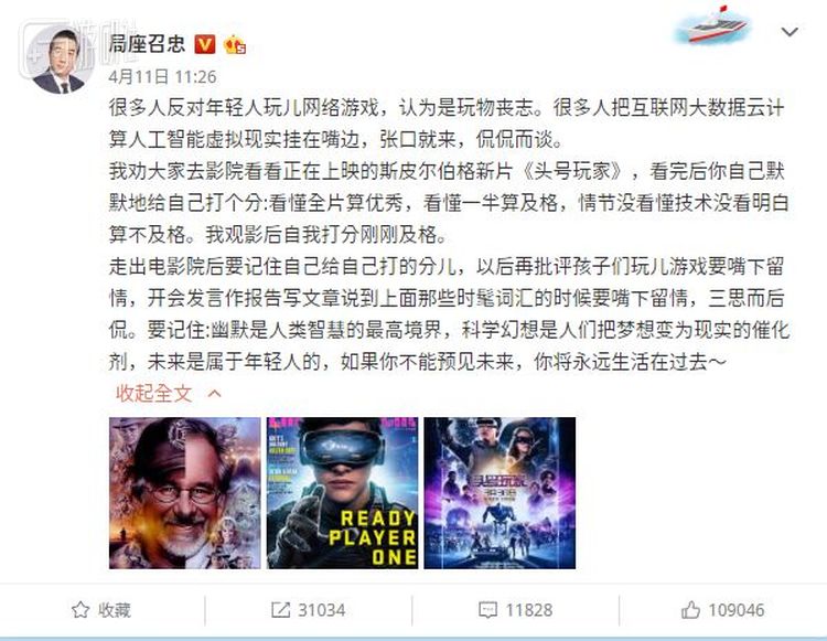前不久,“局座”张召忠刚看完《头号玩家》,自我打分说自己看懂一半,刚刚及格,呼吁“以后再批评孩子们玩儿游戏要嘴下留情,开会发言作报告写文章说到上面那些时髦词汇的时候要嘴下留情,三思而后侃。”