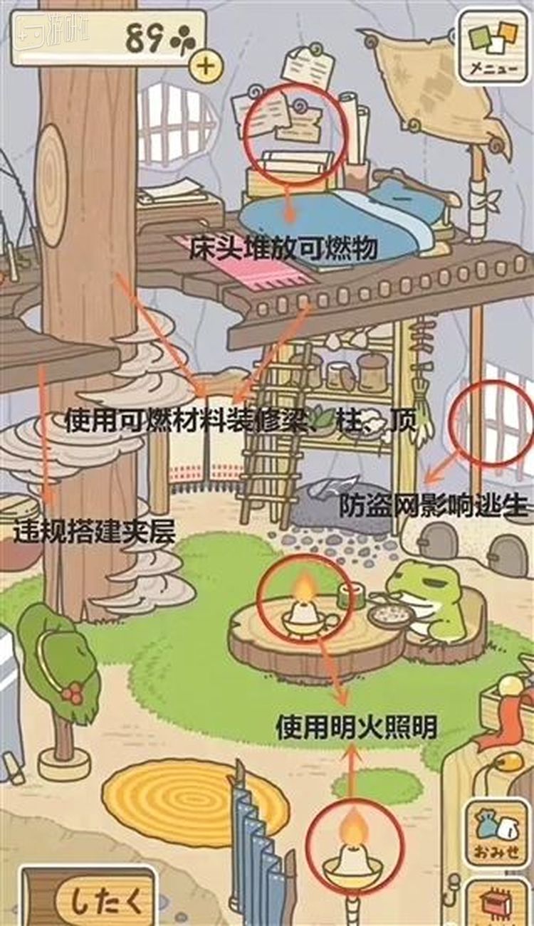其实在今年1月,中国消防就发过一张《旅行青蛙》的图,盘点了“娃儿子”室内的消防隐患。