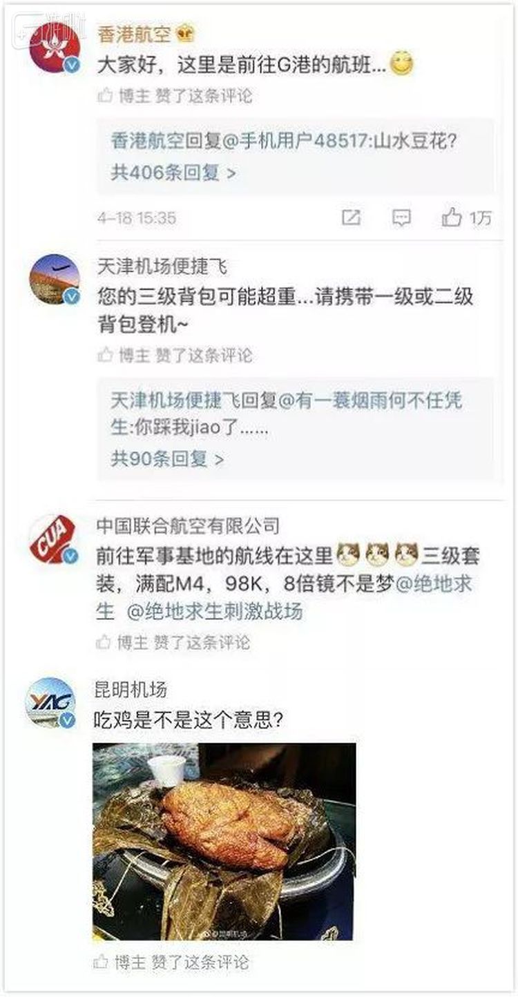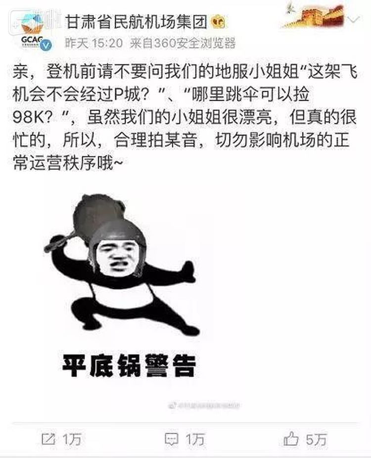 想通的当然也不光他们,也是这两天,甘肃省民航机场集团的官方微博也向广大的吃鸡玩家发了一条警示公告。