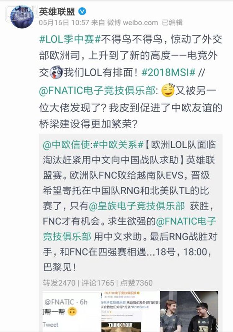 当时《英雄联盟》季中赛正在进行,欧洲队FNC因为败给了越南队EVS,只能把希望寄托在中国队RNG与北美队TL的比赛当中,只有中国队获胜,欧洲队才能晋级。