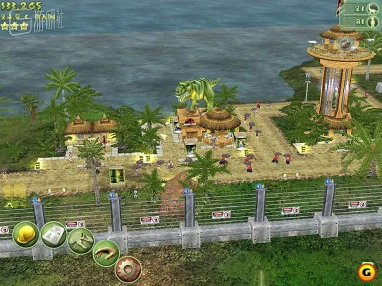 只要围起栅栏铺上路,放上恐龙就有源源不断地收入,其他游乐设施除了名字之外大同小异,可用的建筑种类比较有限。