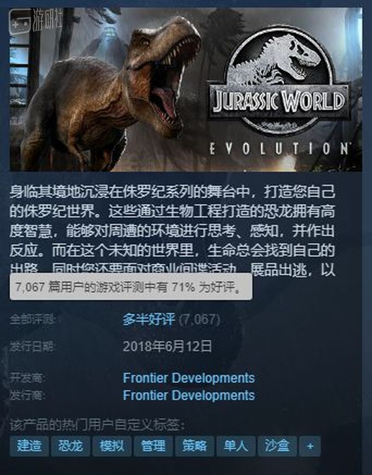 作为一款受众有限的经营游戏,《侏罗纪世界:进化》(下文简称JWE)能在多个平台大卖,并终结《绝地求生》的连冠登上Steam周榜本身就令人惊讶。更值得注意的是,JWE本身存在诸多短板,媒体评价一般,IGN更是只给出了4.8的低分,但Steam上的好评率却有71%,达到了多半好评。这一切成绩都让人不得不感慨,“侏罗纪公园”的名号真是有种神奇的力量。