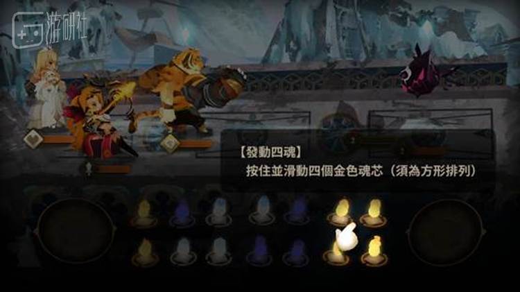 游戏里的战斗是以消魂发动技能的方式进行的。屏幕下方的区域就是操作区,叫作“魂盘”,会随机出现两排由黄、紫、白组成的魂。每个角色都有1魂、2魂、4魂的技能,玩家需要结合战斗情况和“魂盘”的排列情况,用拖拽的方式把魂消去,发动角色技能进行游戏。