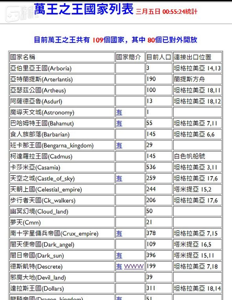 到1999年3月5日,《万王之王MUD》里已经有109个王国,每个王国的人数从1到数百人不等。字面上说,100个王国只是达成了“万王之王”愿景的百分之一,一国人口数量也相当寒碜。但这种人与人之间建立国家、相互争战的强社交联系,将成为未来十多年中国网游的缩影。