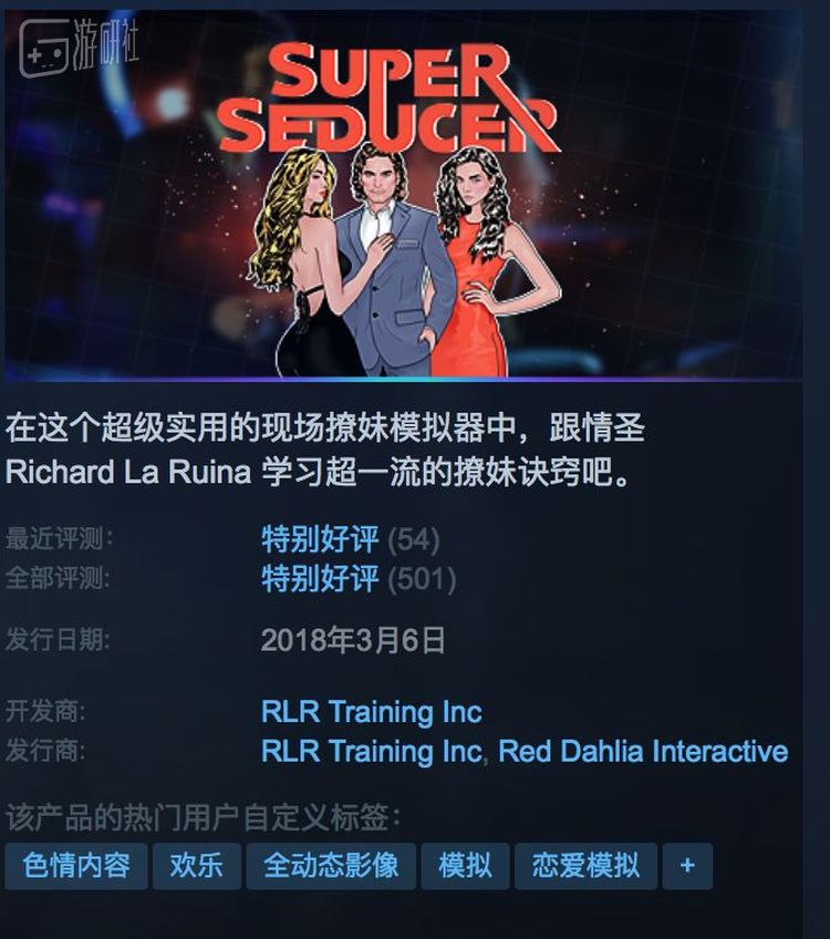 在Steam上,有一款很特殊的游戏——《Super Seducer》(中文译名:绝世情圣),用户评价也不错。从商店页面介绍来看,它是个“现场撩妹模拟器”,并且会有“情圣”来教玩家“学习超一流的撩妹诀窍”。