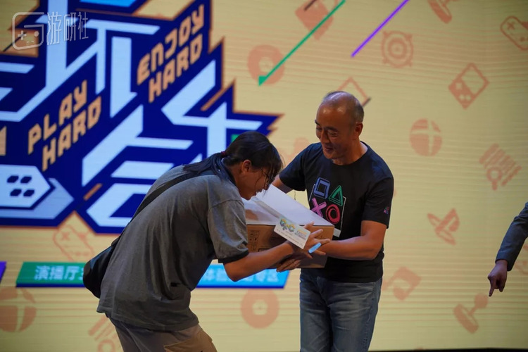近期最为热门的PlayStation相关产品莫过于蓝色透明的“PS4五亿限定机”,这次见面会也拉来了一台重金难求的国行限定版作为活动礼品,现场购机的玩家就有机会直接升级成限定。这个“升级”资格由五仁叔在舞台抽签,被抽中的幸运玩家确认自己身份之后立刻从观众席连跑带颠来到舞台,路上还险些摔了一跤,可见小哥当时有多兴奋。