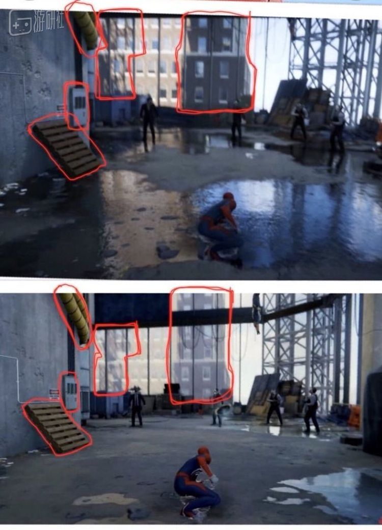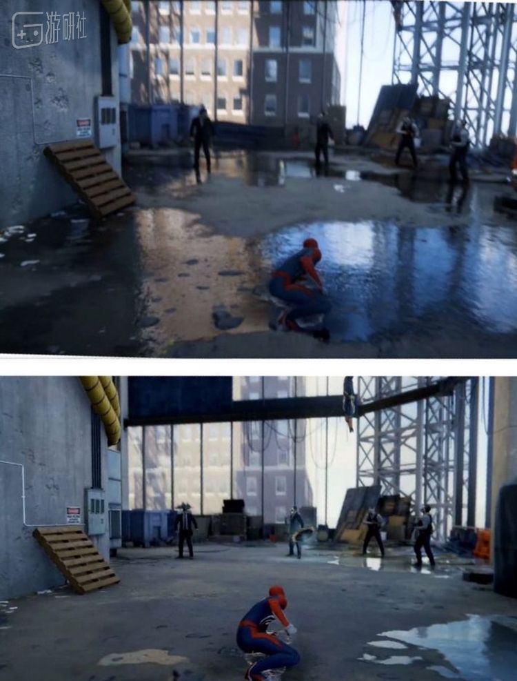 事情的起因,是有国外网友发了一张《蜘蛛侠》最新预告片和2017年E3展上首次公布时预告片的对比图。这两张图中的场景是一致的,但画面水平似乎有些差距,最明显的区别,就是后图的水坑面积大大减少了。
