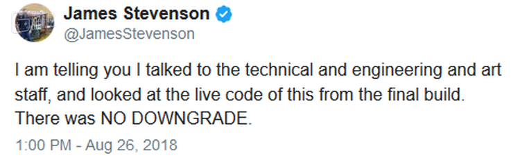 Stevenson最后表示,他已经让参与开发的工程技术和美术设计人员去调查了这段演示里的代码,他肯定,游戏是没有缩水的。