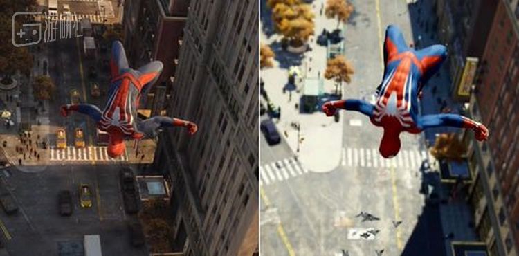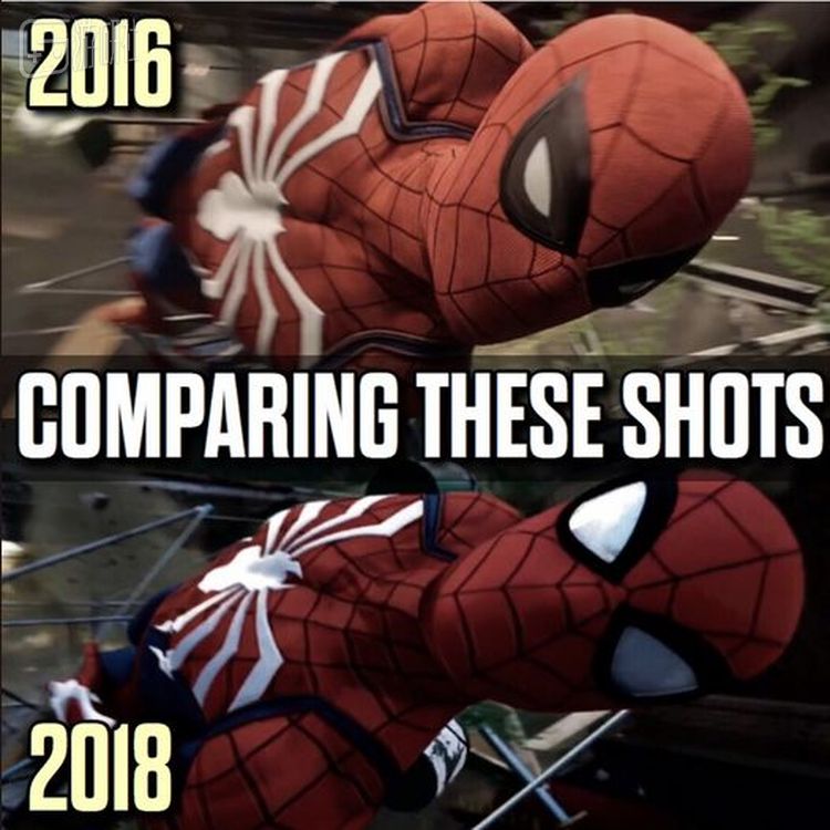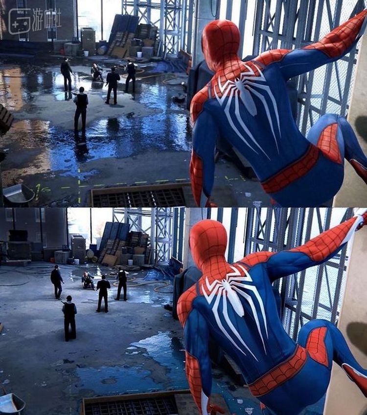 之后,这张图在互联网上快速传播,随即便有网友开始质疑《蜘蛛侠》的游戏画面缩水。随着更多对比图被挖出,玩友们发现,除了水坑减少,画面的光影和蜘蛛侠战衣的材质都有显著的不同,直观地看,最新演示的画面水平比之前是差了一点。