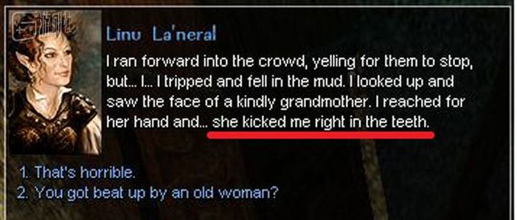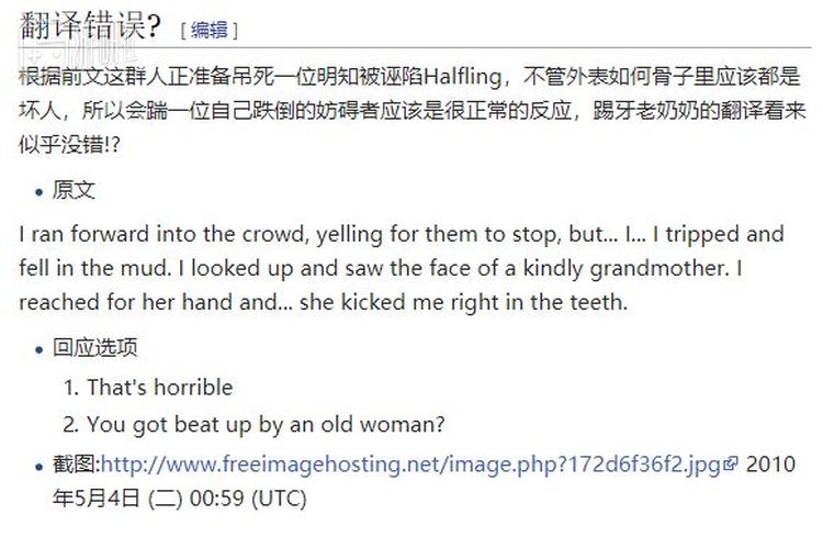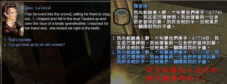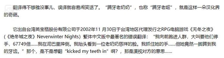 2002年,英宝格公司在台湾地区发行了《Neverwinter Nights》(《无冬之夜》)的繁体中文版,然而汉化质量鬼哭神嚎,有玩家截下了百余张汉化问题的截图,一时传为佳话,而“踢牙老奶奶”成为了其中最有代表性的一个例子。这些大家都已经很熟悉了。