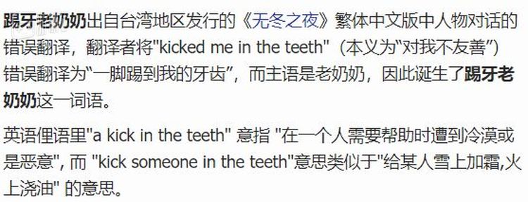 ①(百度百科“踢牙老奶奶”条目) 此处的一脚踢到我的牙齿是一句误译。推测原文应该是英文成语“kicked in my teeth”,指漠视对方。