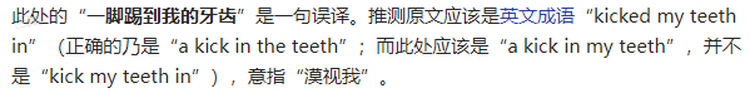 ②(维基百科“踢牙老奶奶”条目) 此处的“一脚踢到我的牙齿”是一句误译,原文是英文成语“a kick in my teeth”,意指“漠视”、“不理睬”。