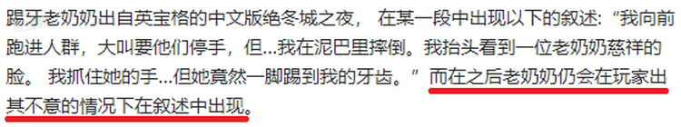 正如在比较图中我们就可以看到的,原图是和NPC的对话,而中文版中的截图则是在完全不同的事件中出现的,从描述到选项全都是“踢牙老奶奶”的文本,这正是汉化完全错误的体现。试想玩家在嚼着本就错误百出的翻译文本时,眼前却时不时蹿出一段和上下文完全无关、又从描述到选项全都是相同的“踢牙老奶奶”文本,又怎能不印象深刻?