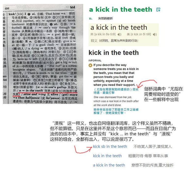 事实上a kick in the teeth这个词组,但凡是写对了,就绝对可以在各种词典和在线词典中找到正确释义的——就连我家这本1979年版的《新英汉词典》也清清楚楚地列着解释。但有的时候,“众所周知的常识”就是这么强大,让你明知它有错误,却还是选择在整体上去相信它。