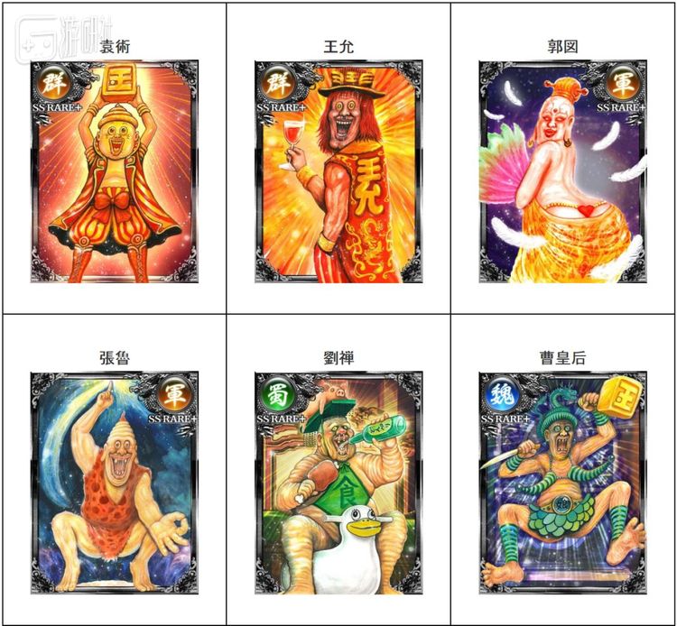自然也有一些类似手冢治虫的作品那样完全颠覆了人们认识中的三国形象的合作,给游戏增添了一些乐趣。比如和画风十分荒诞的漫画家“漫☆画太郎”合作创作的这些形象: