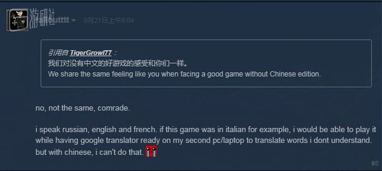 面对这些 “need English”的国外玩家,围观的国内玩家们顿时也感同身受。其中一位玩家言简意赅地回复说:“我们对没有中文的好游戏的感受和你们一样。”