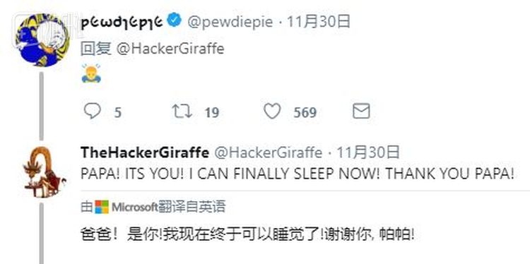很难说这次攻击的主要目的是“提醒安全问题”还是“为PewDiePie拉票”。黑客长颈鹿明显是一位PewDiePie的忠实粉丝,即使在解释原委的推特中,黑客长颈鹿还是没忘记艾特PewDiePie。在得到了PewDiePie一个表情的回复后,黑客长颈鹿回复“PAPA!是你!我终于可以睡觉了,谢谢你PAPA。”(PAPA是粉丝对PewDiePie的昵称)。