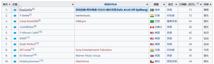 YouTube订阅榜单的前十名,第三名只有不到5000万订阅,远低于PewDiePie