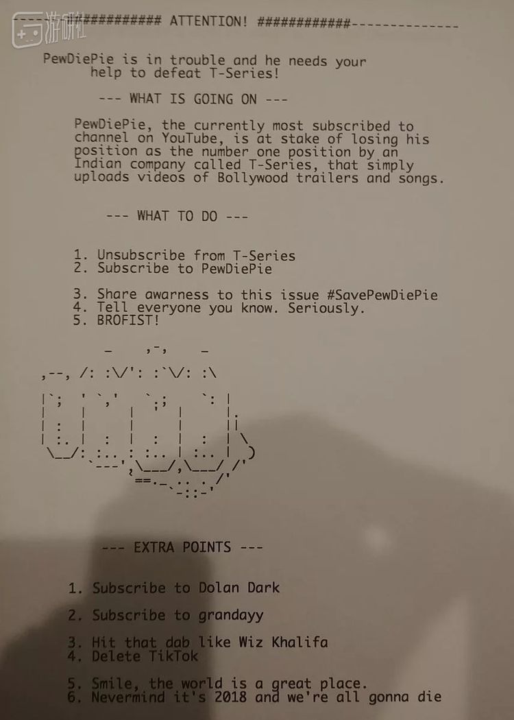 来自北美和英国的一些网友,前几天在推特上表示自家的打印机突然印出了一份奇怪的消息。消息称:PewDiePie有麻烦了,他需要大家帮忙,来打败T-Series;希望看到这份消息的人赶紧取消订阅T-Series,订阅PewDiePie并告诉周围的人,让他们也这么做。