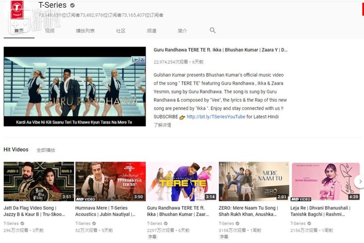 T-Series是一家来自印度的公司,主要经营唱片和电影业务。为了宣传自家产品,T-Series也在YouTube上开设了频道,发布一些来自宝莱坞的电影宣传片和唱片MV。这种公司设立的官方频道在YouTube上有很多,大部分都不温不火,没法和网红们的个人频道相比——T-Series无疑属于例外。