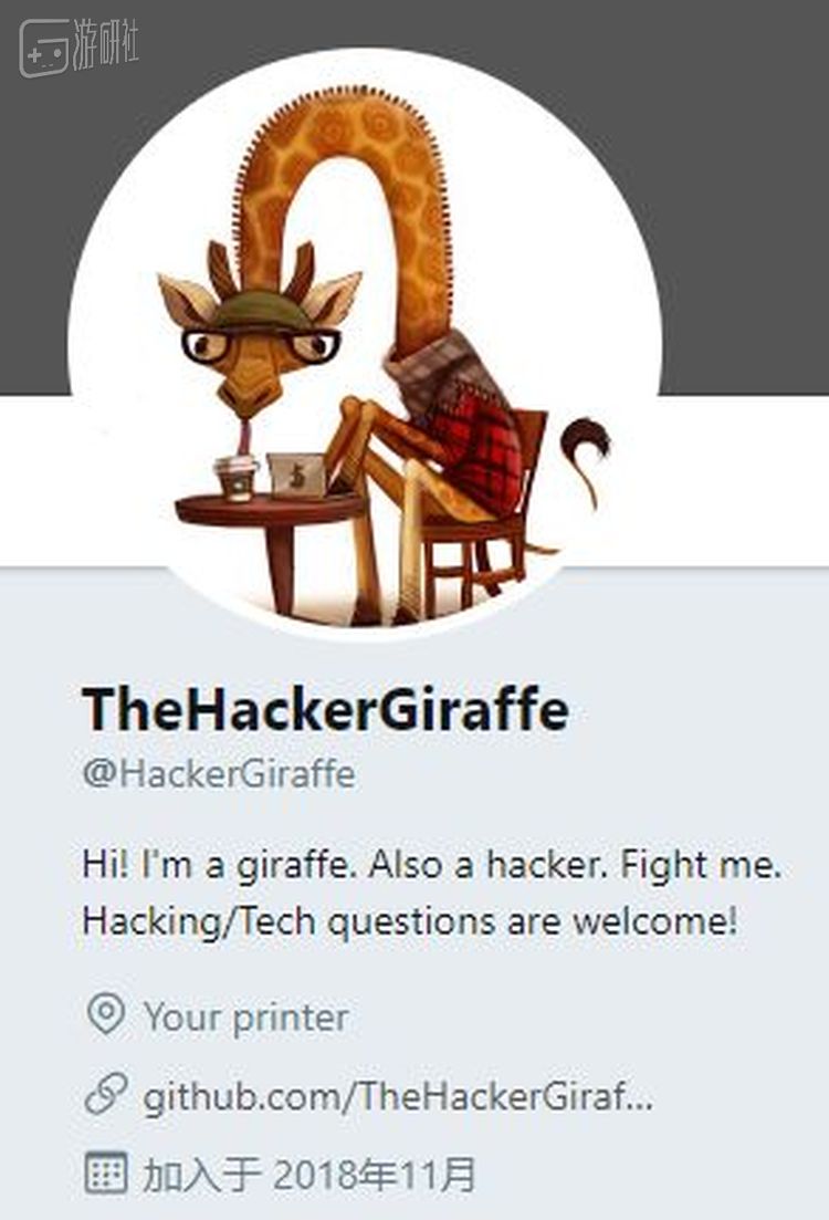 黑客长颈鹿的推特账号,他的住址显示为“你的打印机里”