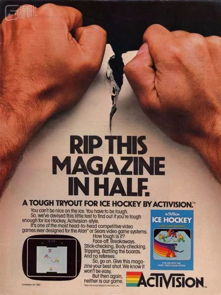 《冰球》是动视在1981年推出的一款体育游戏。为了回避简陋的游戏画面与封面,动视采用了文案激将法,在广告中让读者把手中的杂志撕成两半,看看读者是否足够强悍以挑战这款游戏。