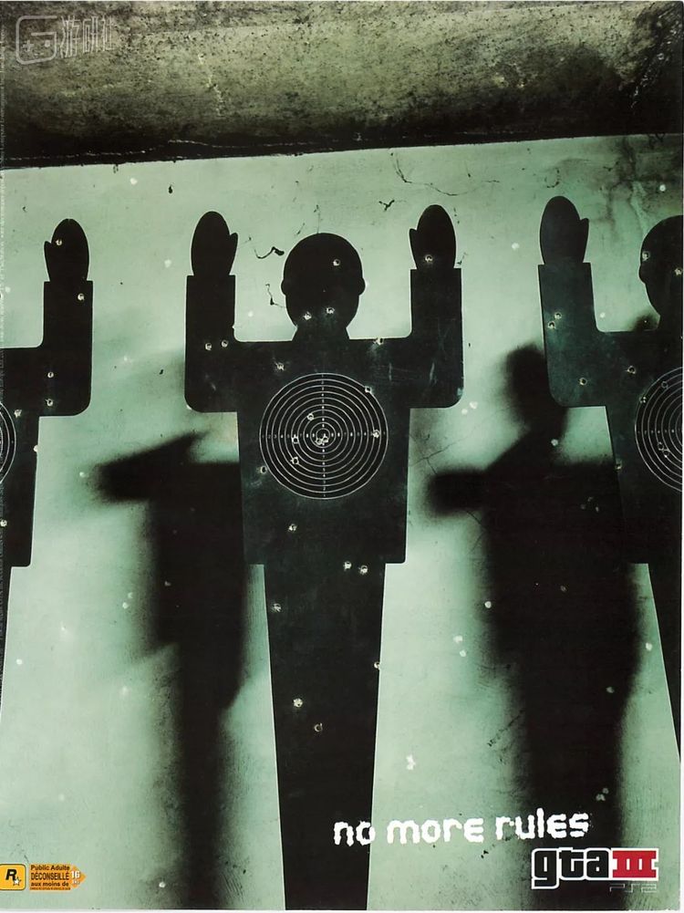 不过,在宣传上,R星似乎丝毫没有回避这种争议。在这则广告中,三个人形靶高举双手表示投降,但上面依然布满了弹痕。很明显这是在暗示游戏的高自由度玩法:无论敌对与否或是否持有武器,只要你想,任何人都可以成为你的枪靶子。