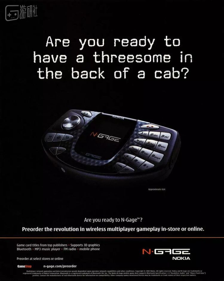 这则N-Gage广告的广告词“你是否准备好出租车后排来一次三人行?”引人浮想联翩。实际上,这里的“三人行”指的是N-Gage的无线联机功能,这在当时的掌机行业中尚不多见,就算是和N-Gage同年发售的任天堂Game Boy Advance SP也没有搭载这一功能,需要安装专门的附加配件才能够进行无线联机。