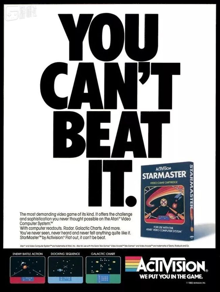 一年后,动视又在自家的飞行射击游戏《Starmaster》的广告中用了同样的套路。这次的广告词更加直白和具有挑衅意味,直接告诉读者根本无法打通这款游戏。