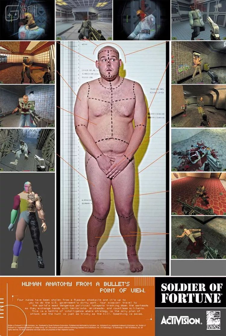 这款游戏有着细致的断肢系统,击中敌人不同的部位都会有相应的伤害效果。为了突出这一卖点,Raven找来了一名男子,按着游戏中的断肢部位在他身上画上相应的虚线,还附上相应的截图以免读者产生误会。