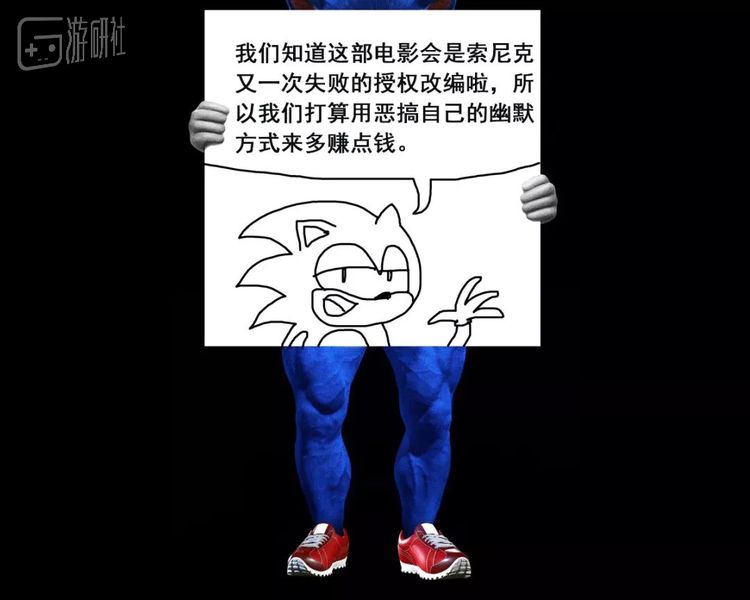 在推主 @Uberchu 看来,官方这一手秀出更粗的毛大腿的操作,完全是知道电影肯定很烂,干脆走上自黑吸金的道路。于是他就手绘了一个索尼克拼接到毛大腿上,道出“官方的心声”。