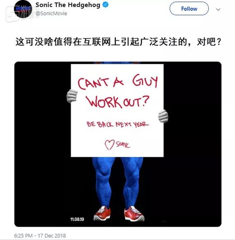 在这一次的图中,索尼克坚持露出它更加粗壮的两条毛大腿,还举了一快白板横在身前,上面半开玩笑地写着“男人就不可以健身吗?”