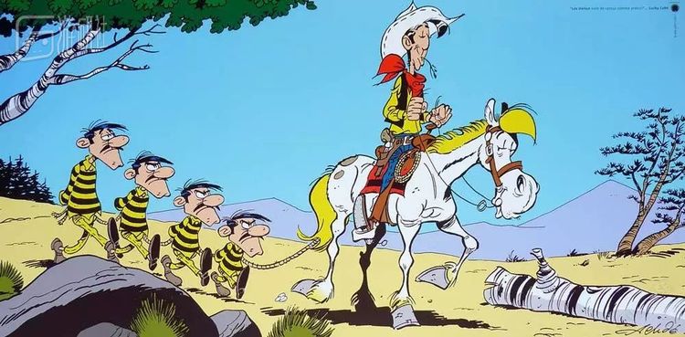 回想一下,《幸运的鲁克》还有什么让你至今难忘的元素?笨笨的监狱狗,聪明的白马,还有四个身高呈等差数列的罪犯,这些统统都是高斯尼想出来的!
