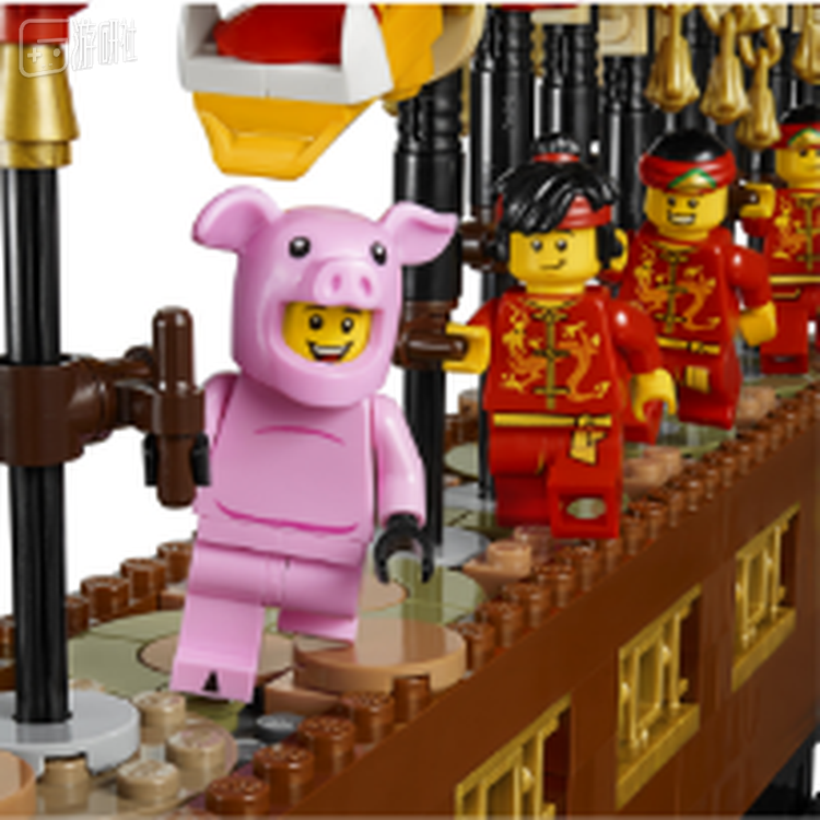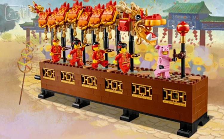 应景农历猪年,享有超高人气的粉色小猪仔在乐高®【舞龙】套装之中再次重现,手持龙珠走在舞龙队伍前列。其他小人仔们也换上了传统的龙绣装扮,神态各异准备开始一场表演。七节红色舞龙,从龙须到龙鳞都逼真还原,转动砖砌城墙一侧的手柄,舞龙的每个关节还能随之上下翻腾,大家仿佛真的来到传统新春庙会,热闹不已。